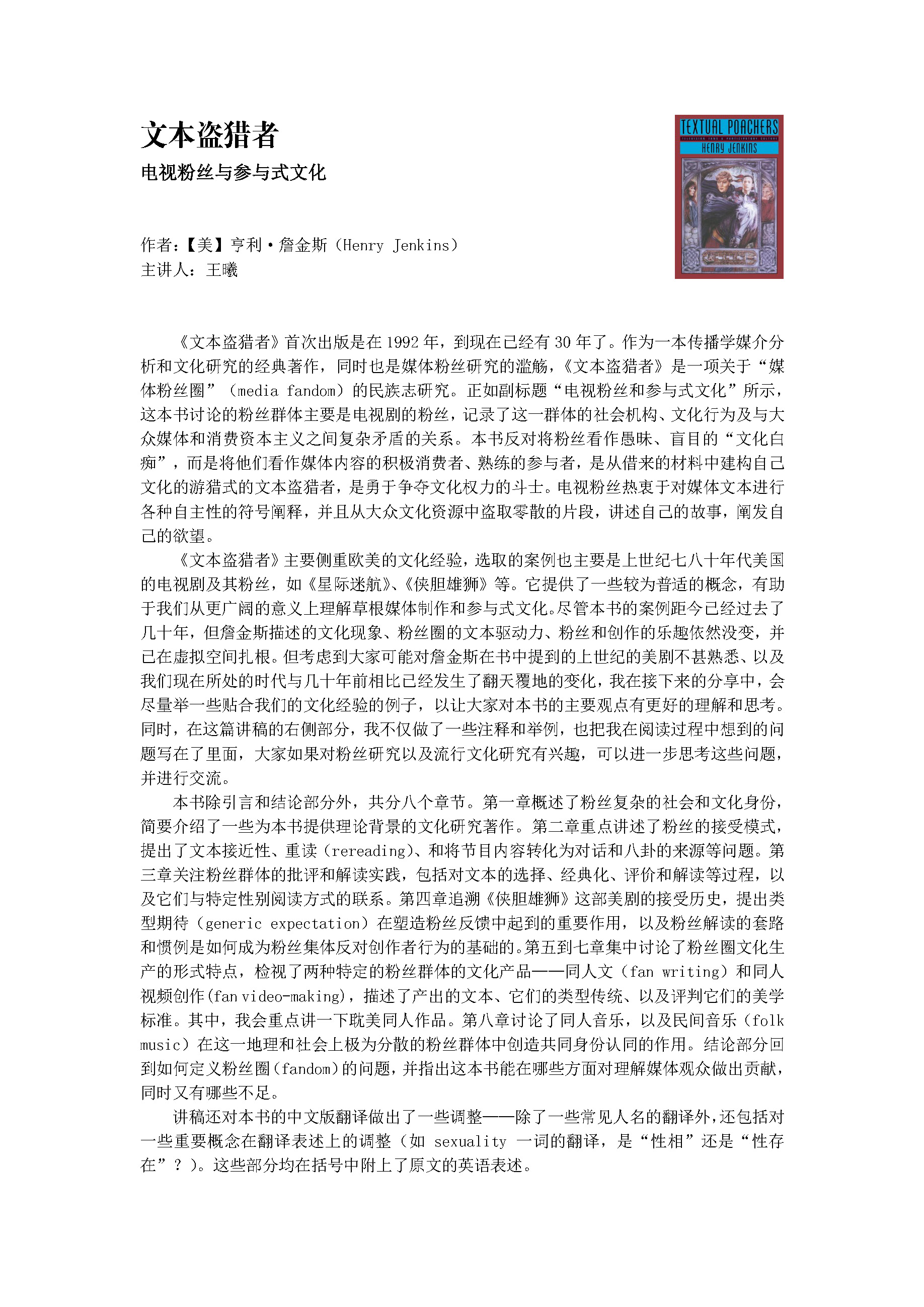 这篇讲稿整理了我对亨利·詹金斯(Henry Jenkins)的《文本盗猎者》(Textual Poachers)一书所做的笔记和思考,用于2022年11月1日在人大刘海龙老师组织的“海龙果读书会”上的领读分享。讲稿大部分内容是对原文(我认为的)重点的提炼,并附有一些我个人的评价和思考,权当是一份读书笔记,可以帮助你在不到一个小时内浏览完《文本盗猎者》这本书。但我真诚地推荐所有人阅读全书,特别是那些对粉丝研究感兴趣的人,这本书可以实实在在地给予读者很多研究视角上的启发。